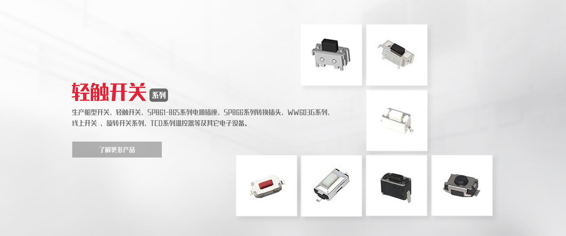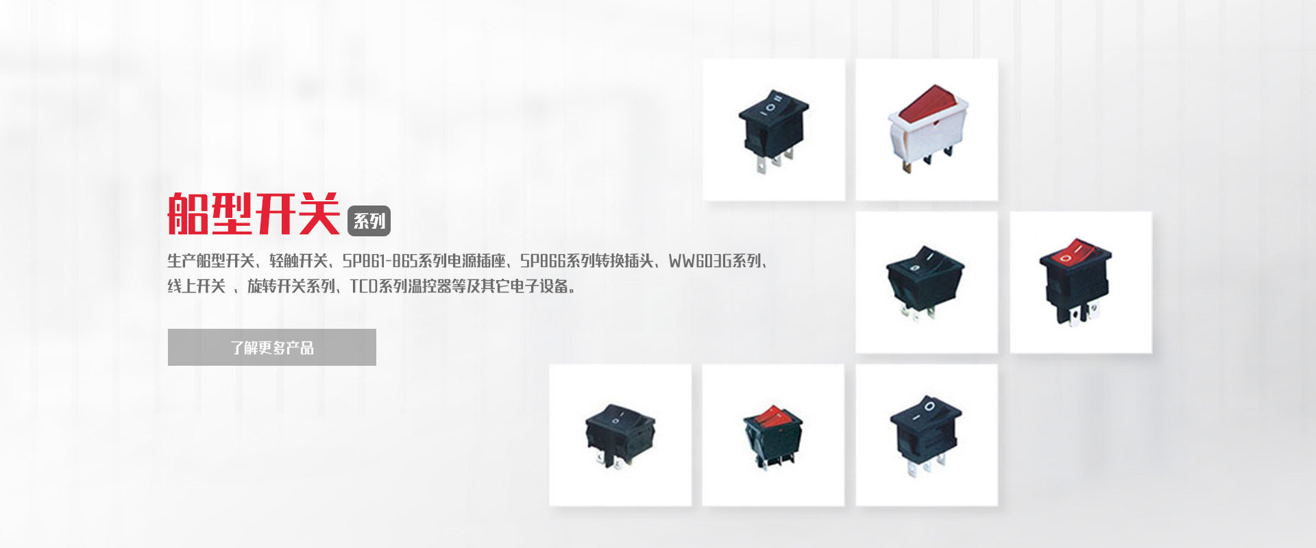 公司專業(yè)生產(chǎn)船型開關、輕觸開關、SP861-865系列電源插座、SP866系列轉換插頭、WW11系列微動開關、WW01-03、09系列按鈕開關DS、WW系列指示燈開關、WW603G系列 線上開關 、旋轉開關系列、TCD系列溫控器等及其它電子設備。
